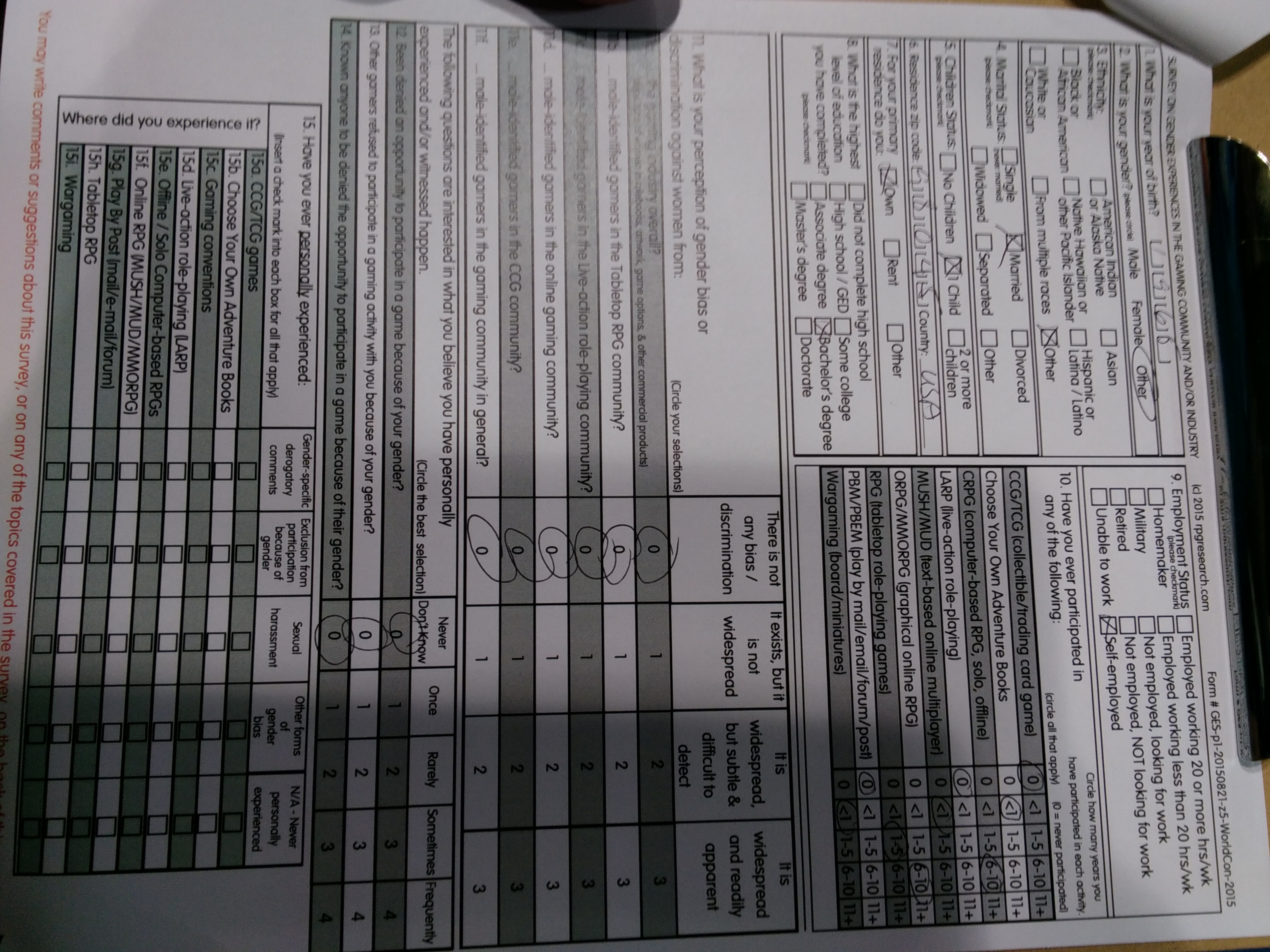 We also met a PHD student doing a gaming survey clearly fishing for victims of prejudice on the part of gamers. He claimed to have started his research before GamerGate began, but for some reason I did not believe him. This is because I am paranoid, I’m sure. I will include this pic of the survey questions if anyone is interested. You’ll need to blow up and reorient it as our image-manipulation abilities are very limited right now. The organization lists their web site as http://www.rpgr.org