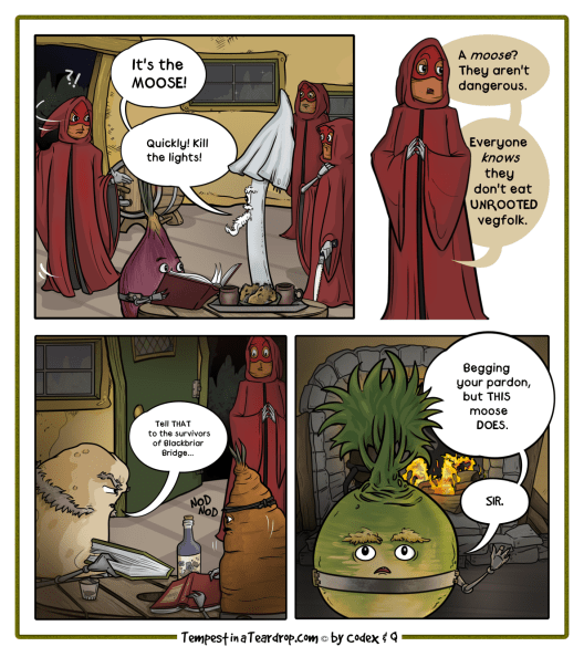 *This* moose is a particular threat as we’ll see in the next couple of comics. The real terror of the forest is Sylvilagus bachmani – the common brush rabbit. If you are one of the VegFolk, pray you never meet one…