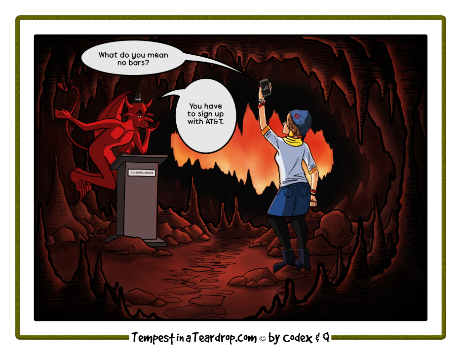 “No, not THAT AT&T. They’re far too ruthless. Asmodean Torture and Treachery – guaranteed service with a simile.” Yes, you may borrow or hat-tip shamelessly; I’m easily repaid by the jokes and running gags.