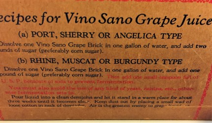 Grocery stores sold “grape bricks”, which were concentrates made from crushed grapes, stems and skins. They came with instructions on how to make grape juice in your own kitchen, with firm warnings not to dissolve the brick in a gallon of water, and if you do, certainly, under no circumstances, hide the jug in your cupboard for three weeks.