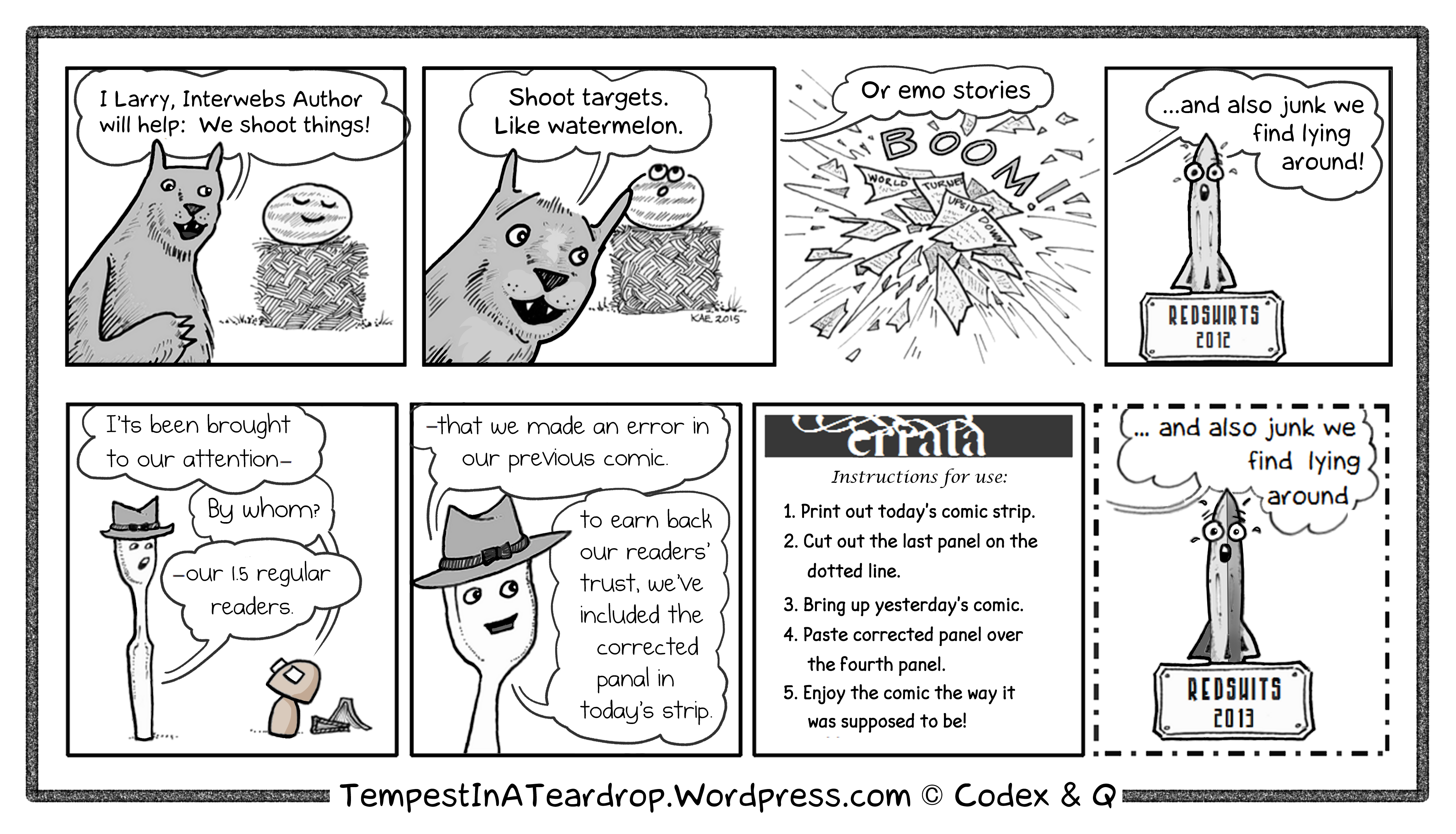 We produced ten or so comics when we first started, to prove to ourselves we would be able to hold to a regular schedule, and could offer the internet something different. This was one of our favorites. It provided an opportunity to play with our readers, make fun of ourselves, and push the limits on how family-friendly we were going to be. The misspelling was unfortunate, but these things happen.