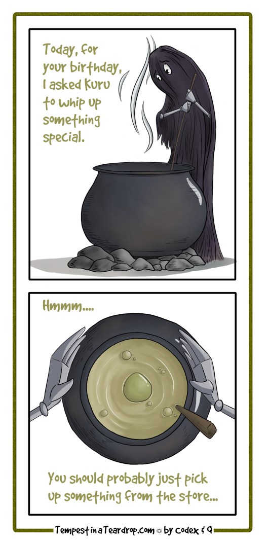 Everyone here is in various stages of sick, getting over sick, or coming down with sick. We call it “the Snottening”. That may be why Q decided that this new character I wanted to draw should be called “Kuru”.