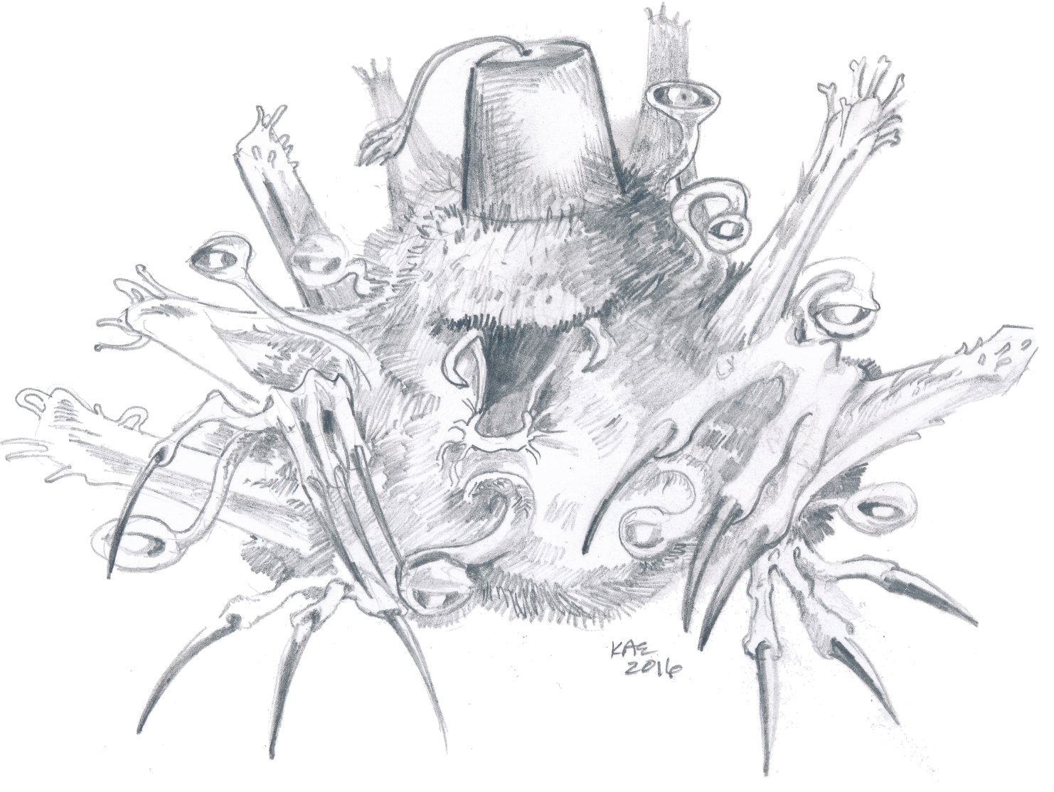 So, anyhoo, one of the things I do when I’m stuck someplace with a flat surface and a pencil is start drawing. Usually on scrap paper. (Like Dave Kellet wrote: shelves of elegant sketch books too pretty to disturb… back of an envelope? no problemo) Mostly they’re relevant to my kid, or copyright protected 1. Usually they’re just… odd.